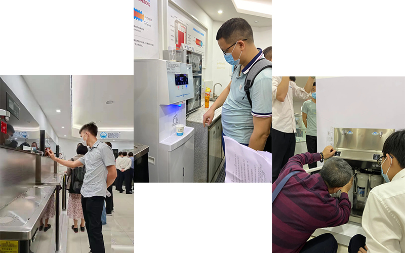 在碧麗營(yíng)銷團(tuán)隊(duì)的簇?fù)硐拢勐斮I家團(tuán)先后參觀了碧麗文化展廳、生產(chǎn)車間、產(chǎn)品展廳、科研室,看碧麗是如何打造高品質(zhì)商用凈水產(chǎn)品。