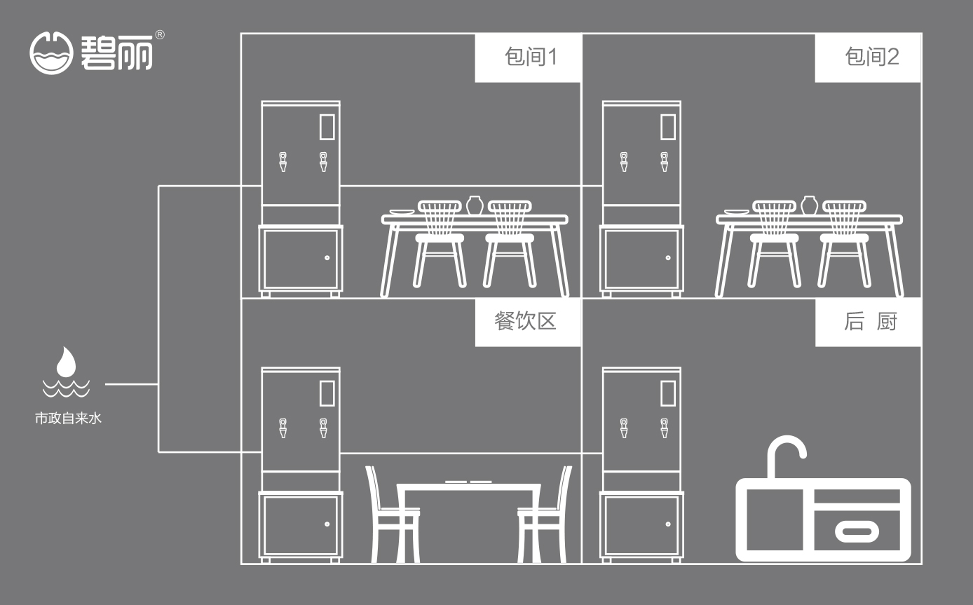 碧麗商用反滲透純水機(jī)將自來水集中處理后,把優(yōu)質(zhì)的純凈水通過專用的供水管道輸送到各飲水點(diǎn);