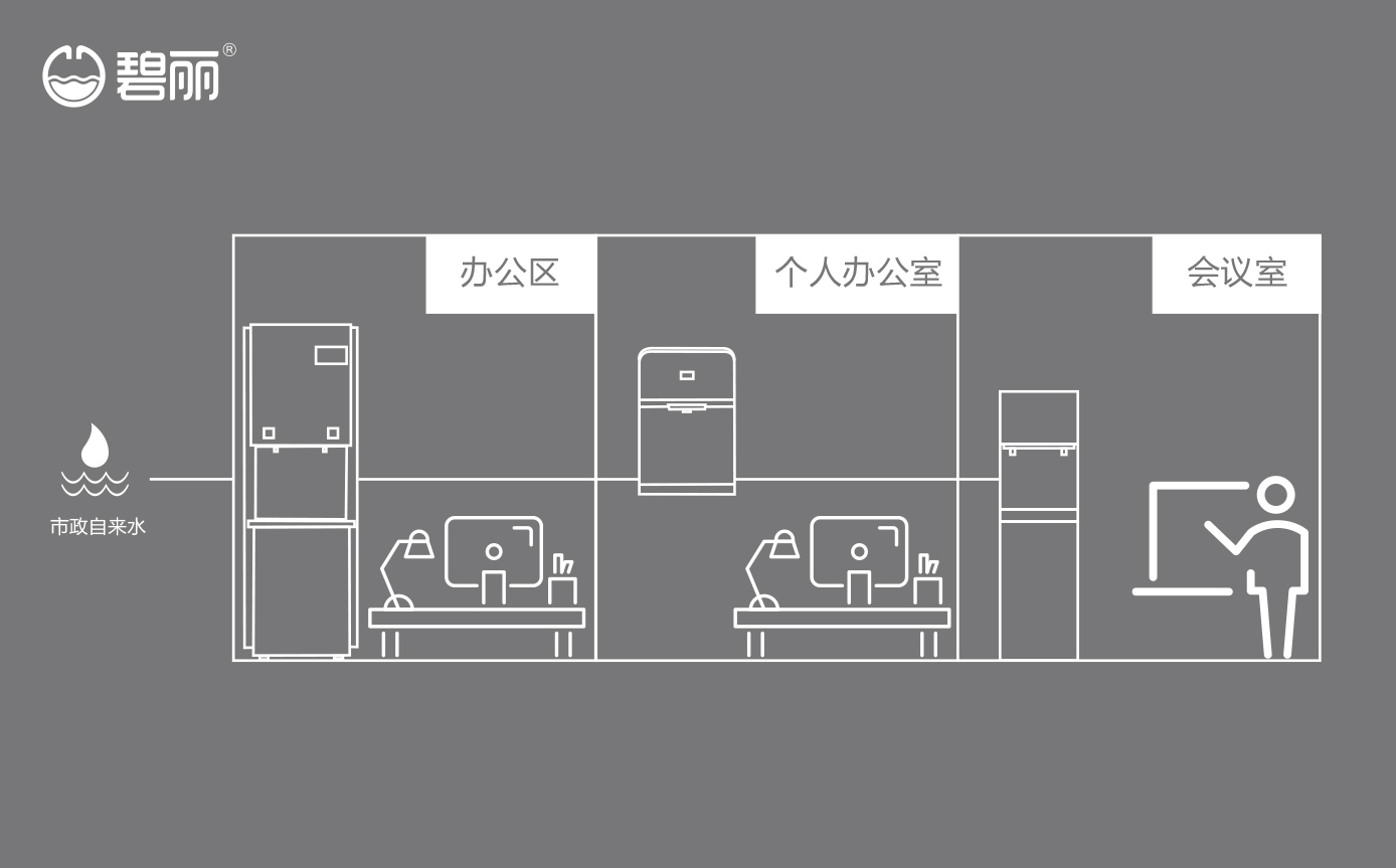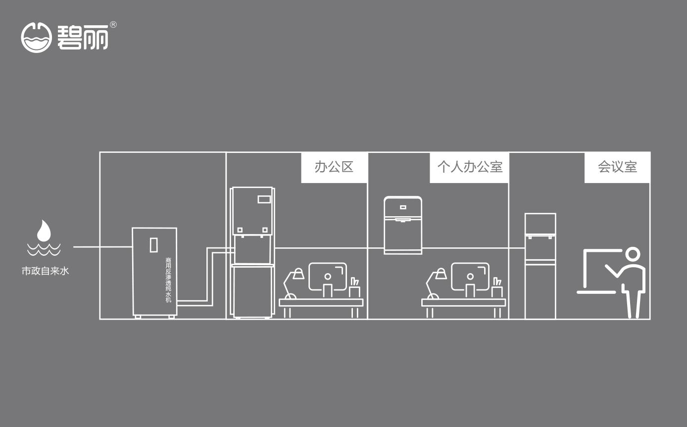 碧麗租賃商用反滲透純水機將自來水集中處理后,把優(yōu)質的純凈水通過專用的供水管道輸送到各飲水點;